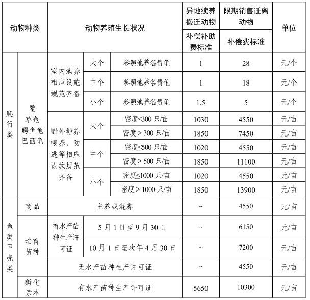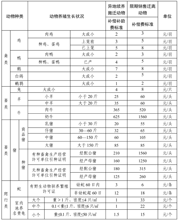 具备续养场地条件的禽畜类和爬行类(龟、鳖、蛇等)动物应实行异地续养搬迁,给予搬迁损失补偿和搬迁补助费;鱼类、甲壳类(虾、蟹等)动物和不具备续养场地条件的禽畜类、爬行类动物应实行限期销售迁离,给予限期销售损失补偿费(对同一动物只给予搬迁补偿补助费或者限期销售损失补偿费)。