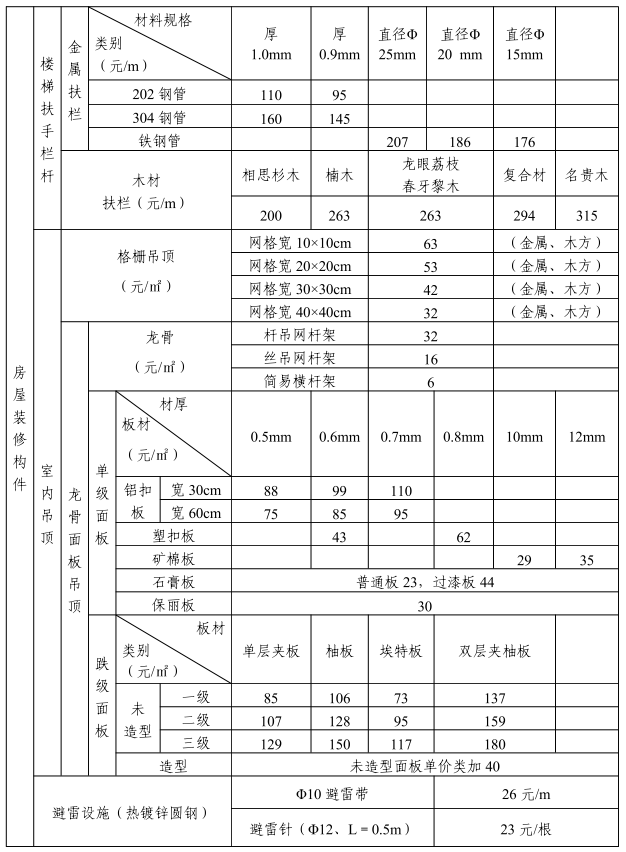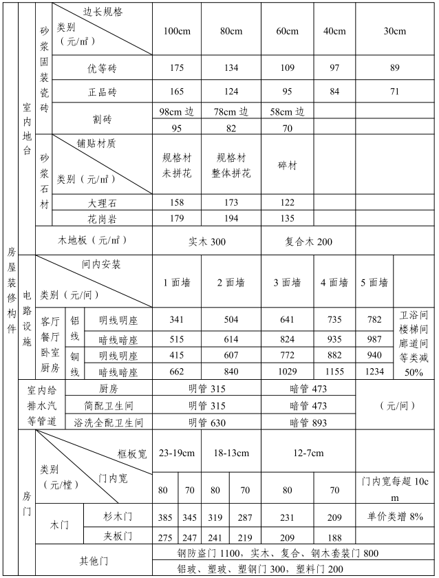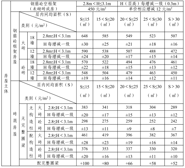 注:表中符号“H”代表房屋层高(米),砖瓦木房屋顶层层高算至侧面山墙顶三角斜线中点,层高增减以0.3米为一级;表中“间均面积”是指同一楼层内各间平均面积,等于本层总建筑面积除以本层间数;“间”是指楼层内以四面砖墙围合的空间,包括客厅、餐厅、卧室、厨房、卫生间、储物间、梯间、廊道等。