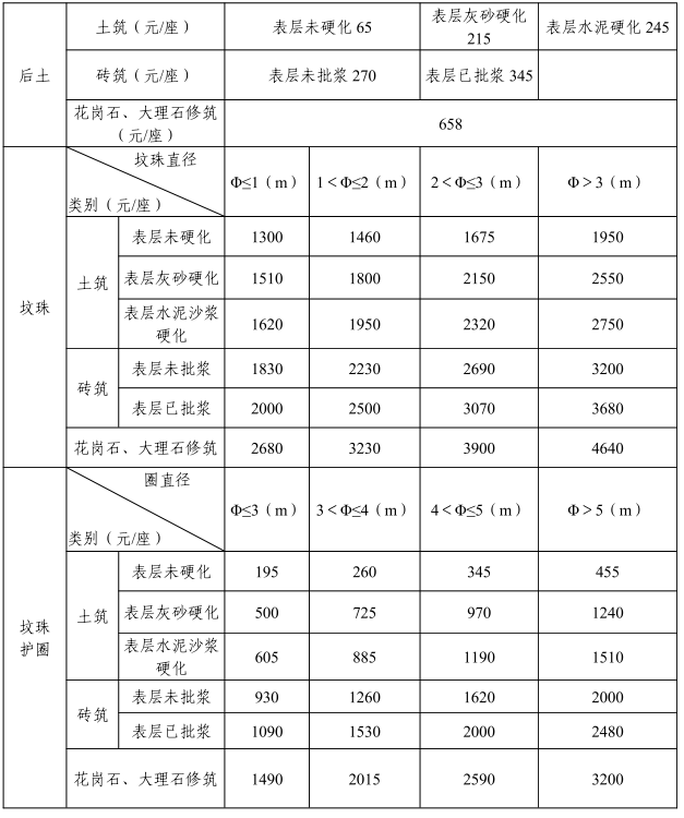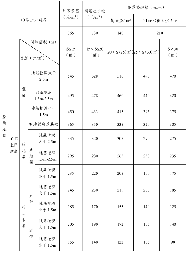 ②表中符号“H”代表简易房高(米),砖瓦木简易房房高算至侧面山墙顶三角斜坡线中点,房高增减以0.3米为一级。