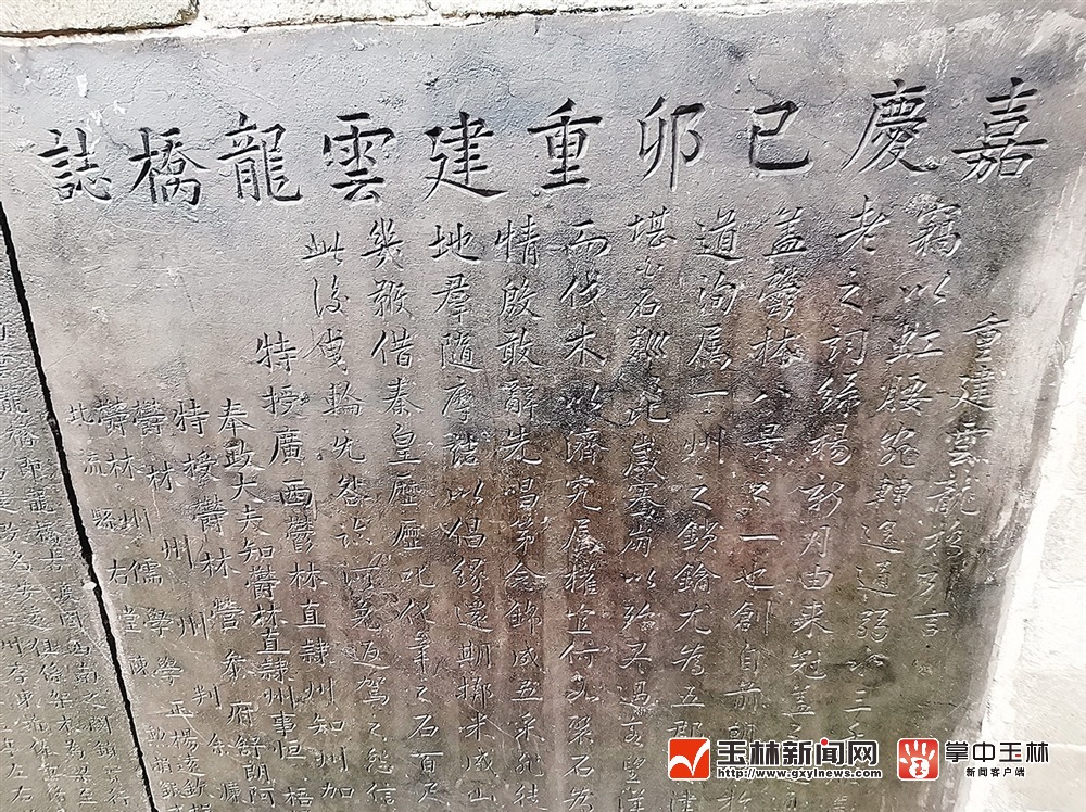 碑墙上立着保存有清嘉庆十五年庚午恩科举人玉林南门口人陈科錂撰写的《重建云龙桥记》、鬱林知州恒梧撰写的《嘉庆己卯重建云龙桥志》和《嘉庆己卯重建云龙桥题名记》等碑刻,从中可了解古桥当年的建造历史。