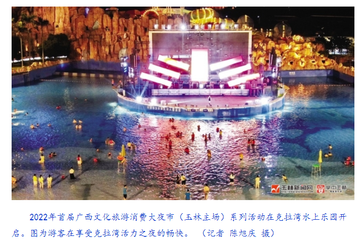 玉林新闻网-玉林日报讯(记者 何挺)6月2日晚,2022年首届广西文化旅游消费大夜市(玉林主场)克拉湾水上乐园“活力之夜”开启,拉开克拉湾旅游消费季系列活动序幕,包括电音秀、啤酒美食节、巡游夜秀、水上乐园周年庆等。