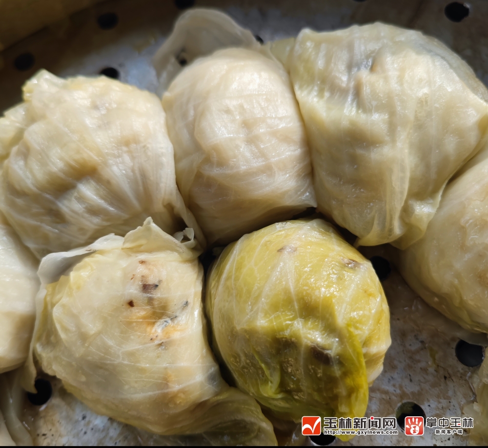 糯米粉和粘米粉搓成粉团,以猪肉碎沫、萝卜粒、木耳等为馅料,外用芥菜叶包裹而成 芥菜包:北流一道“老字号美味”
