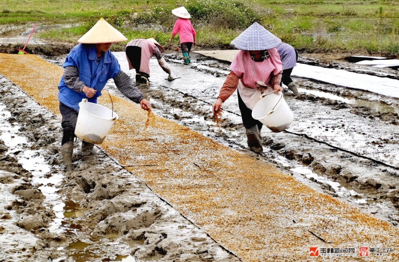 农民在水田进行早稻育秧作业。
