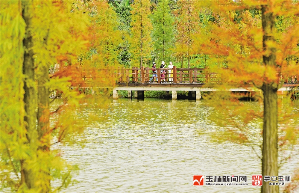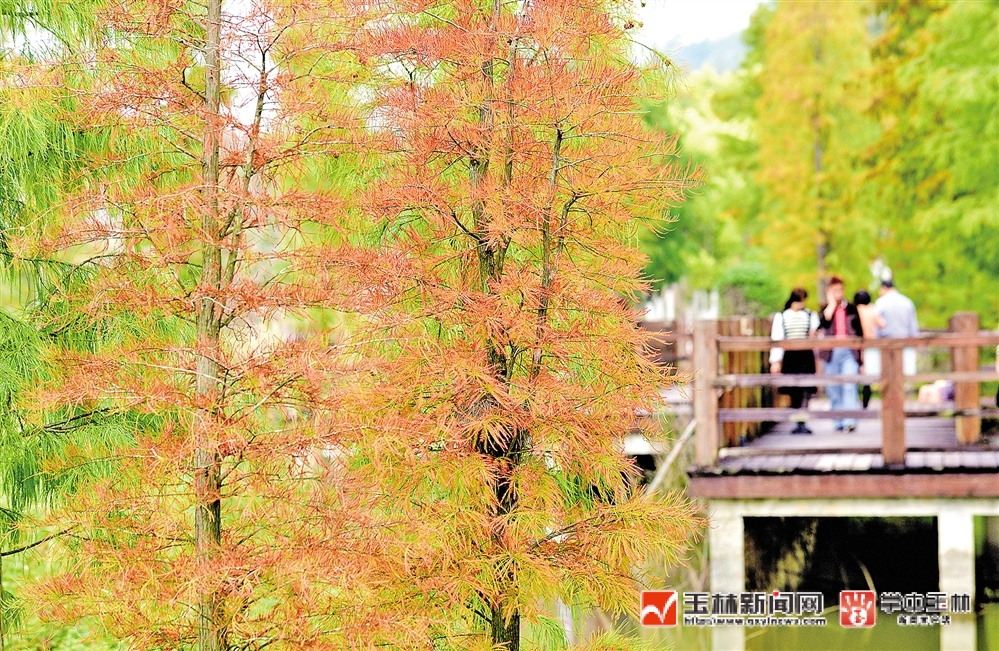 近日,玉林湿地公园的水杉红了!入冬后的水杉树叶,逐渐呈现红色、深红色或金色,多种颜色交织,色彩艳丽。蓝天碧水间,多彩的水杉和水中的倒影相映成趣,似一幅色彩绚丽的水彩画,令人心旷神怡。美景引来众多市民打卡,“这里的水杉拍照很出片,很有氛围感、画面感。”市民赖女士说。