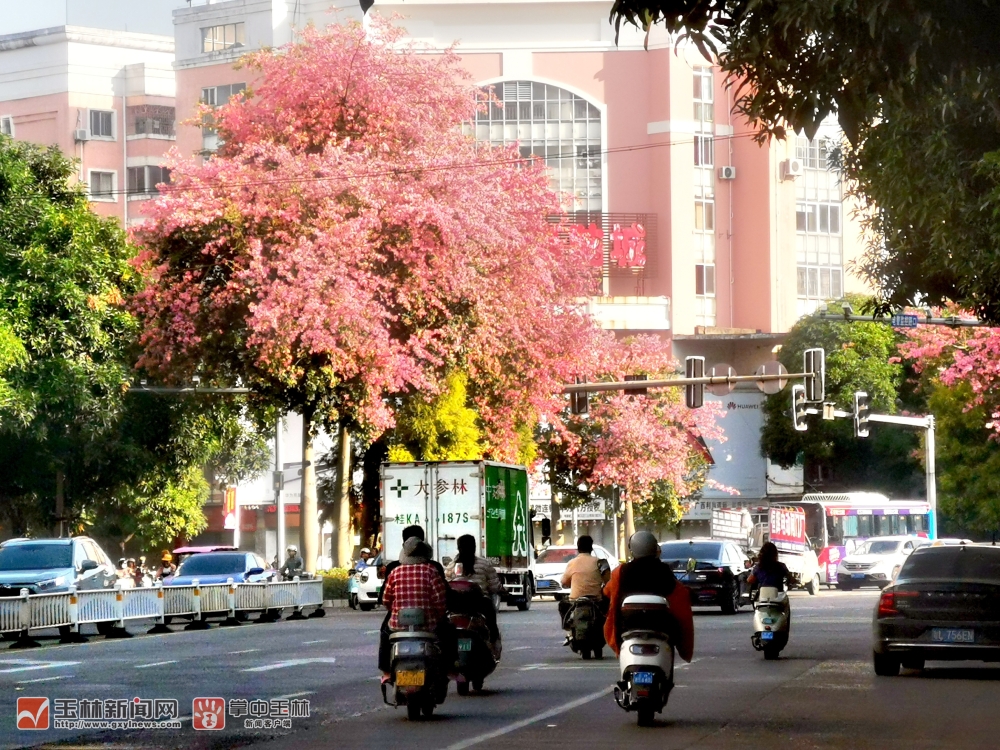 玉林新闻网-玉林晚报讯(记者 黄清 摄)11月,玉城异木棉花开正旺。