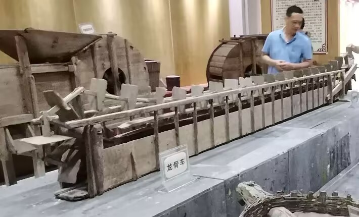玉林还有关于龙的农业耕作工具——龙骨车,因节节木链似根根龙骨而得名。这是一种使用人力或畜力的古老汲水用具,用木制成,像龙骨状,搅动时,骨片将水一节节往上送,主要用途是把水从低处送往高处。在过去常用于抗旱救灾,既轻便,又效率高。