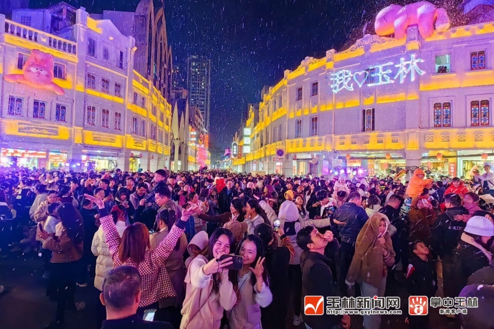 市民和游客在玉林十字街欣赏“雪花秀”,感受玉城独特的文化魅力。 (记者 蒋金泰 摄)
