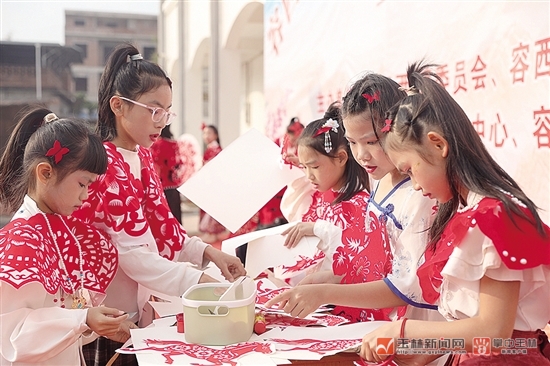 文艺展演活动中,歌曲串烧、舞蹈、非遗剪纸展示、现场书法创作等节目轮番上演,不仅展现了少年儿童阳光向上的精神风貌,也呈现出传统文化与现代艺术在乡村舞台上的交融共生。丰富多彩的游园活动同样吸睛,“你追我赶”“夹纸杯”“背靠背夹球”等趣味游戏区域笑声不断,不少家庭携手闯关,体验运动与竞技的快乐。活动现场还特别设置了剪纸体验区,一把剪刀、数张红纸,指尖流转间,栩栩如生的图案渐次呈现,让参与者在动手实践中深度感受传统民俗文化的独特魅力。