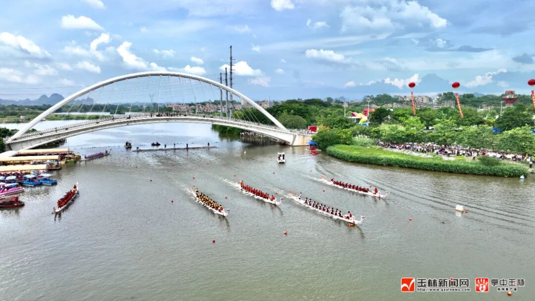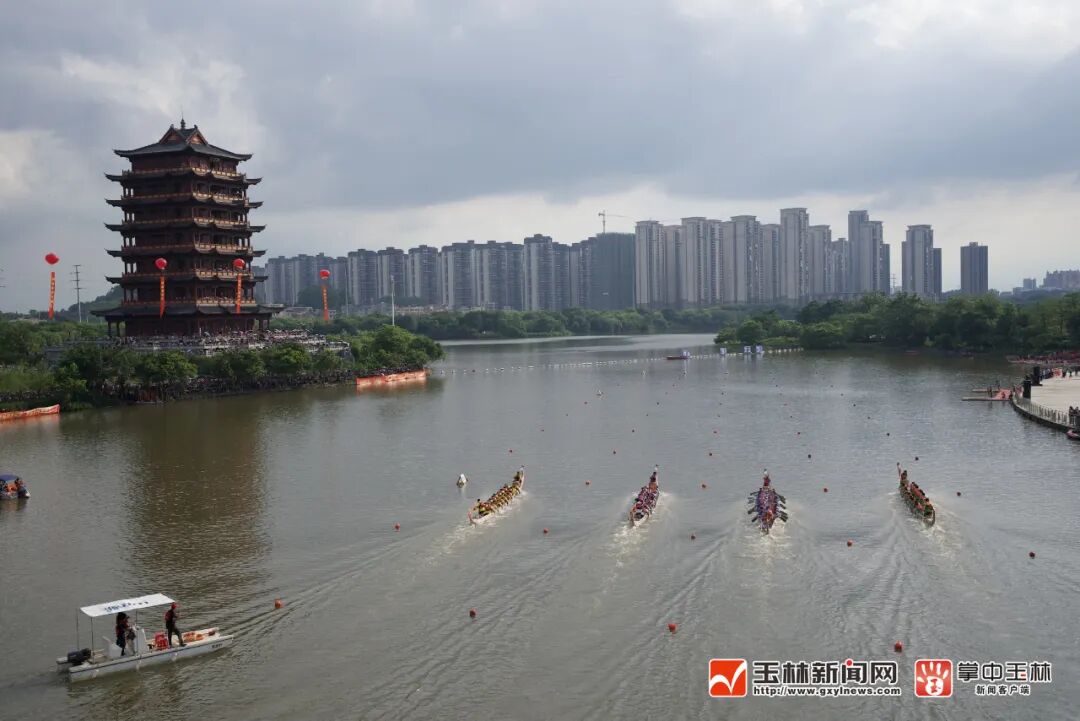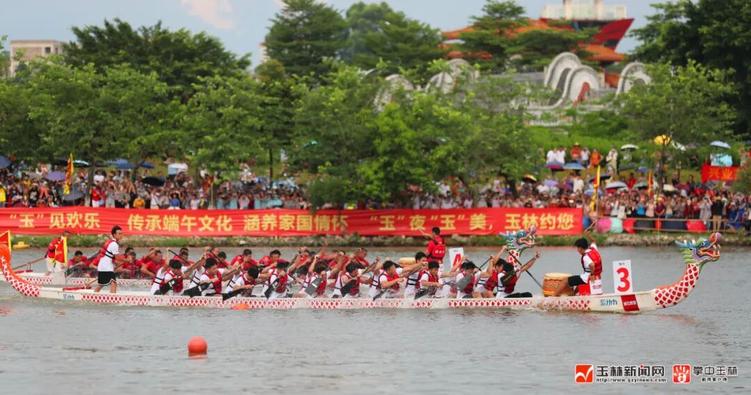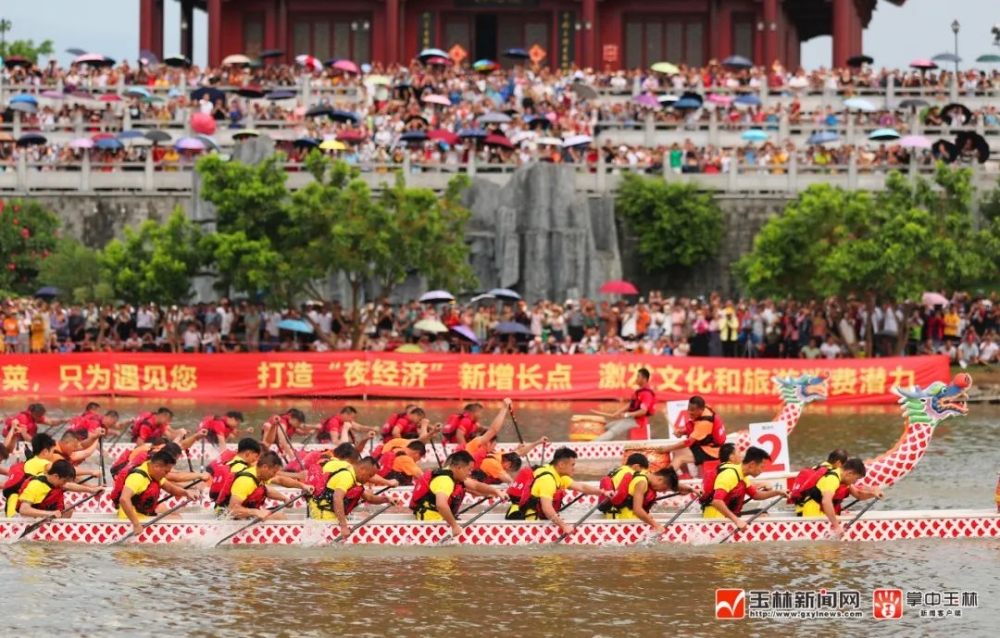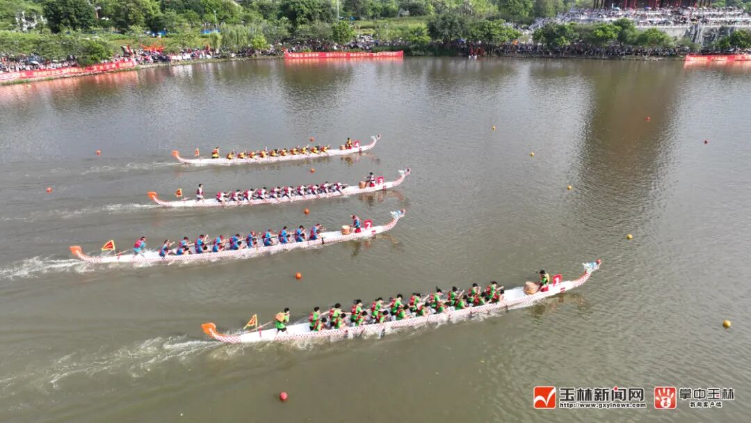 这是2023年玉林市端午文化嘉年华“水韵竞渡”龙舟邀请赛的火热现场。当天17时许,来自广西区内的12支龙舟队展开一场精彩的水上较量,共享龙舟竞渡的“速度与激情”。