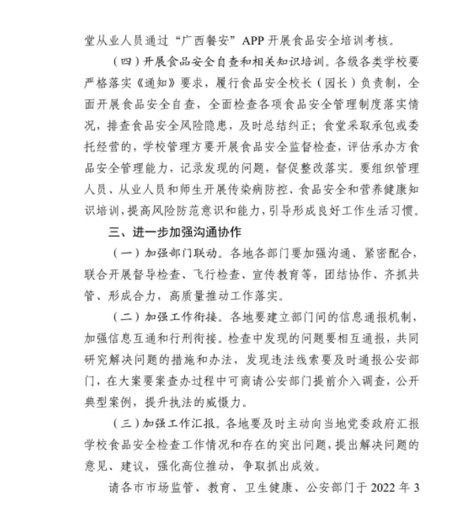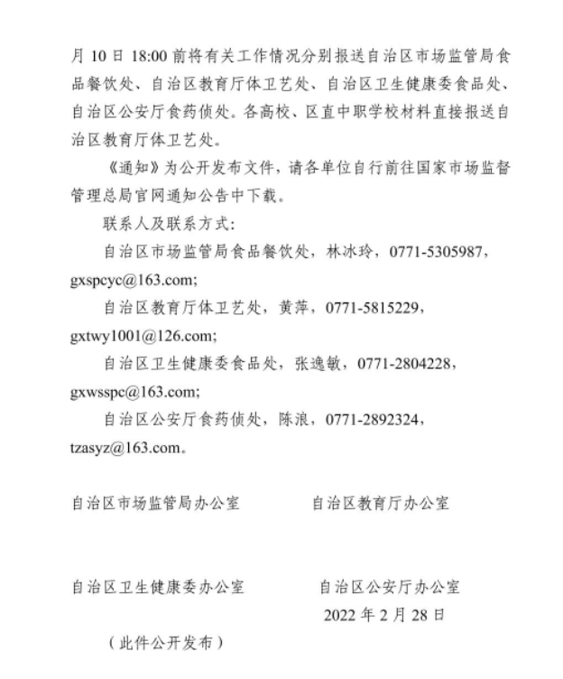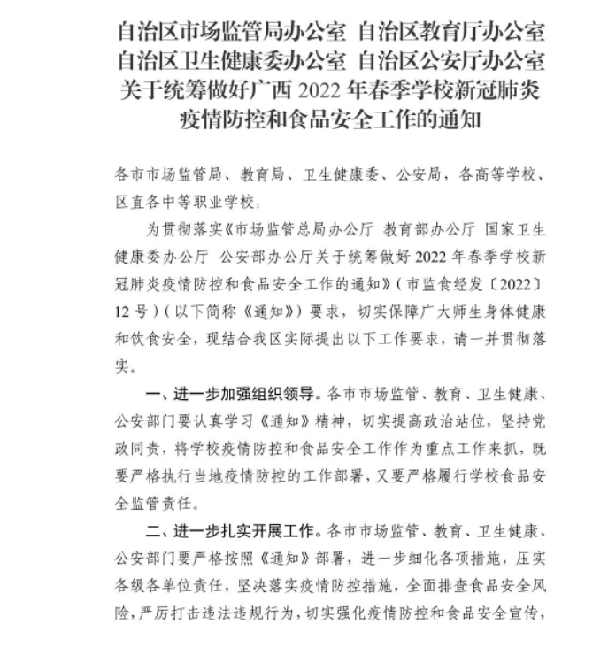 自治区市场监管局办公室 自治区教育厅办公室 自治区卫生健康委办公室 自治区公安厅办公室 关于统筹做好广西2022年春季学校新冠肺炎疫情防控和食品安全工作的通知