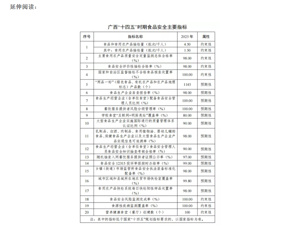 《规划》明确,到2025年,广西食品安全治理体系和治理能力现代化建设将稳步提升,全区食品安全状况明显改善,人民群众对食品安全的获得感、满意度显著提高。