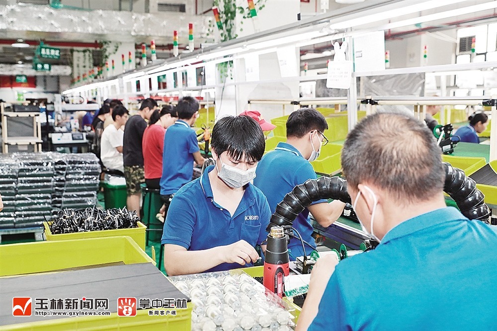 北流市邦泽创科电器有限公司是一家集研发、设计、生产、销售于一体的国家高新技术创新型企业,工人们正在流水线上忙碌着生产出口国外的订单电器。(记者 陈东 摄)