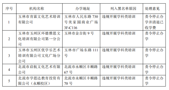 4月8日,玉林市教育局发布《玉林市2022年第二批校外培训机构黑名单的公告》,“玉林市育霖文化艺术培训有限公司”“玉林市玉州区环德雅思文化培训有限公司第一分公司”等5家培训机构违规开展学科类培训,被列入黑名单,并责令停止办学。具体内容如下: