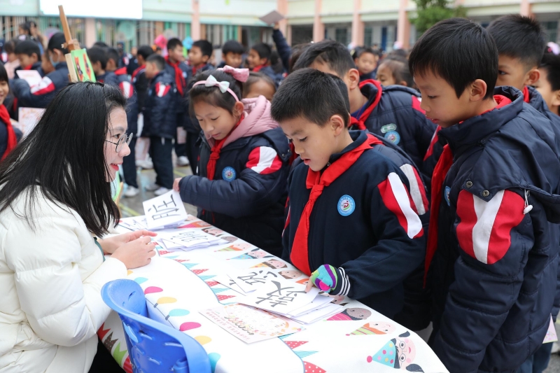 “生字大转盘”闯关,学生转到哪组字卡,就说出字卡上的词语;“正反义词对对碰”闯关,学生抽取卡片,然后说出卡片上词语的反义词;“神机妙算”闯关,老师随机翻出5道计算题,学生在1分钟口算出答案……近日,玉东新区第四小学举办“乐在学中,学于乐中”第二届语数文化节,全校一二年级600多名学生正兴高采烈参加着学校举行的语数游园闯关活动,孩子们游走于不同的闯关项目中“过关斩将”,玩得不亦乐乎。为“双减”赋能,该校积极创新知识检验方法,探索多元评价方式,采取游园闯关的形式,给学生营造轻松、快乐、有趣的氛围进行无纸化检测。该校在去年首届语数文化节的基础上,今年结合学科知识特点和学生身心发展规律,增加内容,设置书法、计算、语出精彩、数你不同、语数游园闯关等项目。