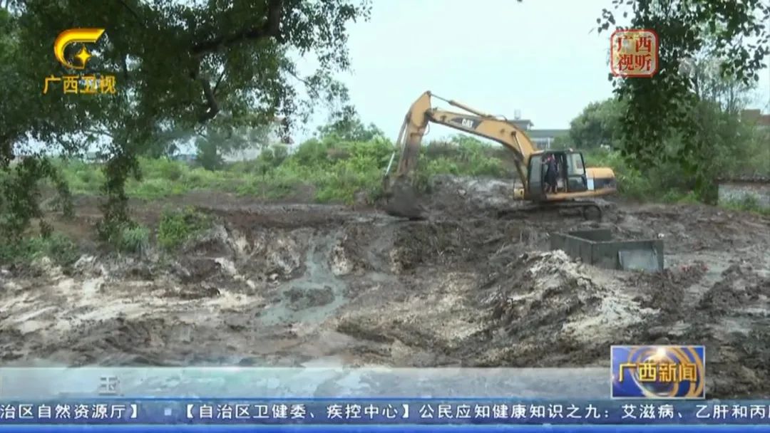 4月19日,工作人员来到兴业县沙塘镇新圩村石塘自然村,只见原有的生猪养殖场已搬迁,猪圈已全部拆除,污粪池用生石灰消毒后已铲除,挖掘机正在对污粪池后的水塘淤泥进行清挖和转运。