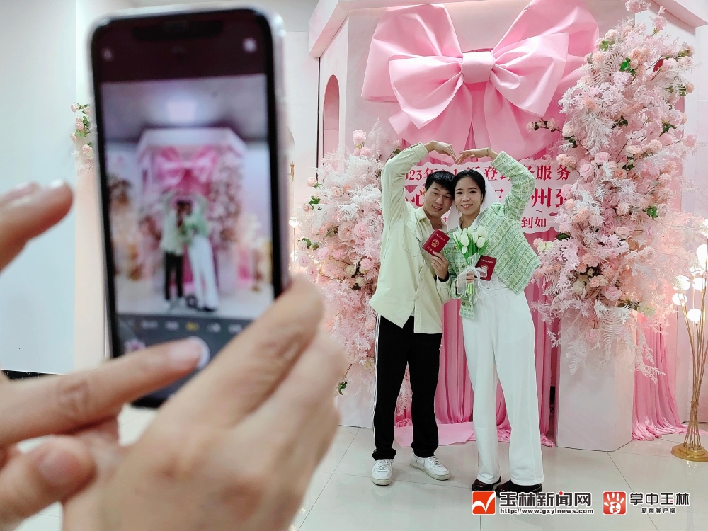 “哇,真是太有仪式感了!”登记处新布置的婚庆场景,让准新娘唐女士惊喜不已。她说,自己是柳州人,准新郎是玉林人,两人都在柳州工作,为了在2月14日这天顺利办好婚姻登记手续,两人提前一天从柳州回到玉林。