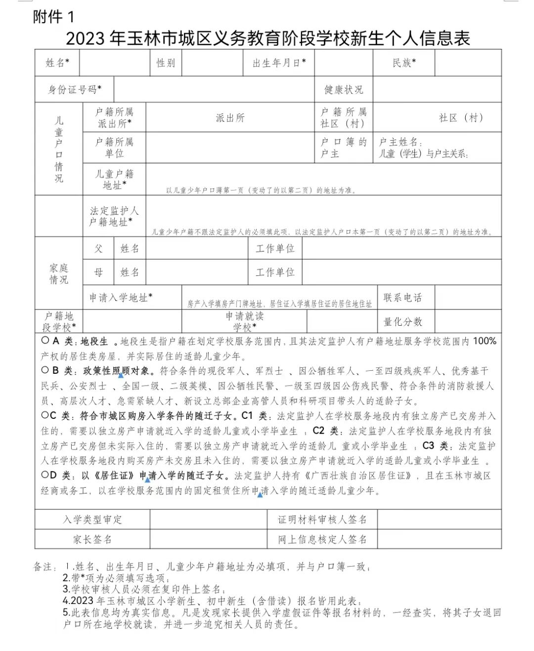 附件:1.2023年玉林市城区义务教育阶段学校新生个人信息表