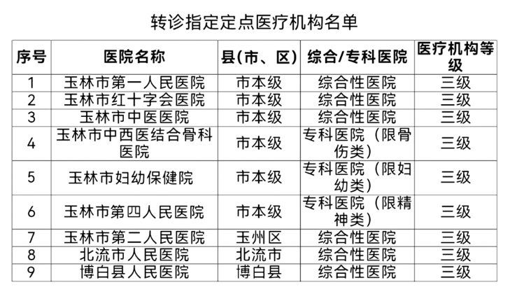 第三种是在网上办理:进入广西数字政务一体化平台(http://zwfw.gxzf.gov.cn/)或广西医疗保障网上服务大厅(https://ybwt.ybj.gxzf.gov.cn/)或通过广西医保、玉林医保微信公众号、广西医保App、国家医保服务平台App、国家异地就医备案微信小程序等线上渠道“异地转诊转院登记”服务项目上传转诊申报材料办理。