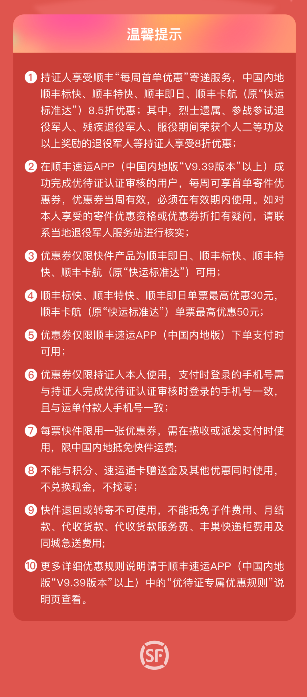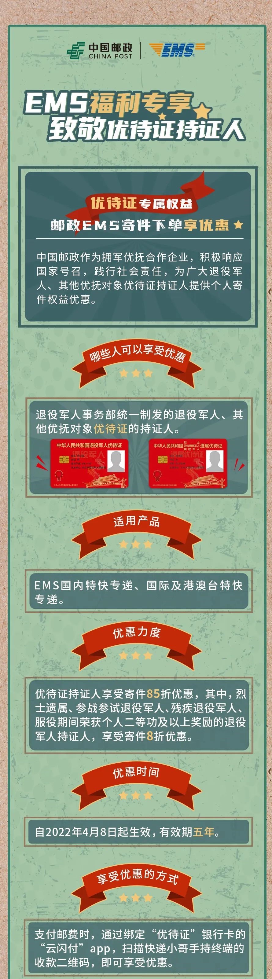 4月8日,退役军人事务部与中国银联、中国石油、中国邮政、顺丰集团、德邦快递等5家企业签署的《拥军优抚合作协议》正式生效。退役军人、其他优抚对象优待证(以下简称优待证)持证人可享受机动车加油、快递邮寄等领域的专属优惠服务。